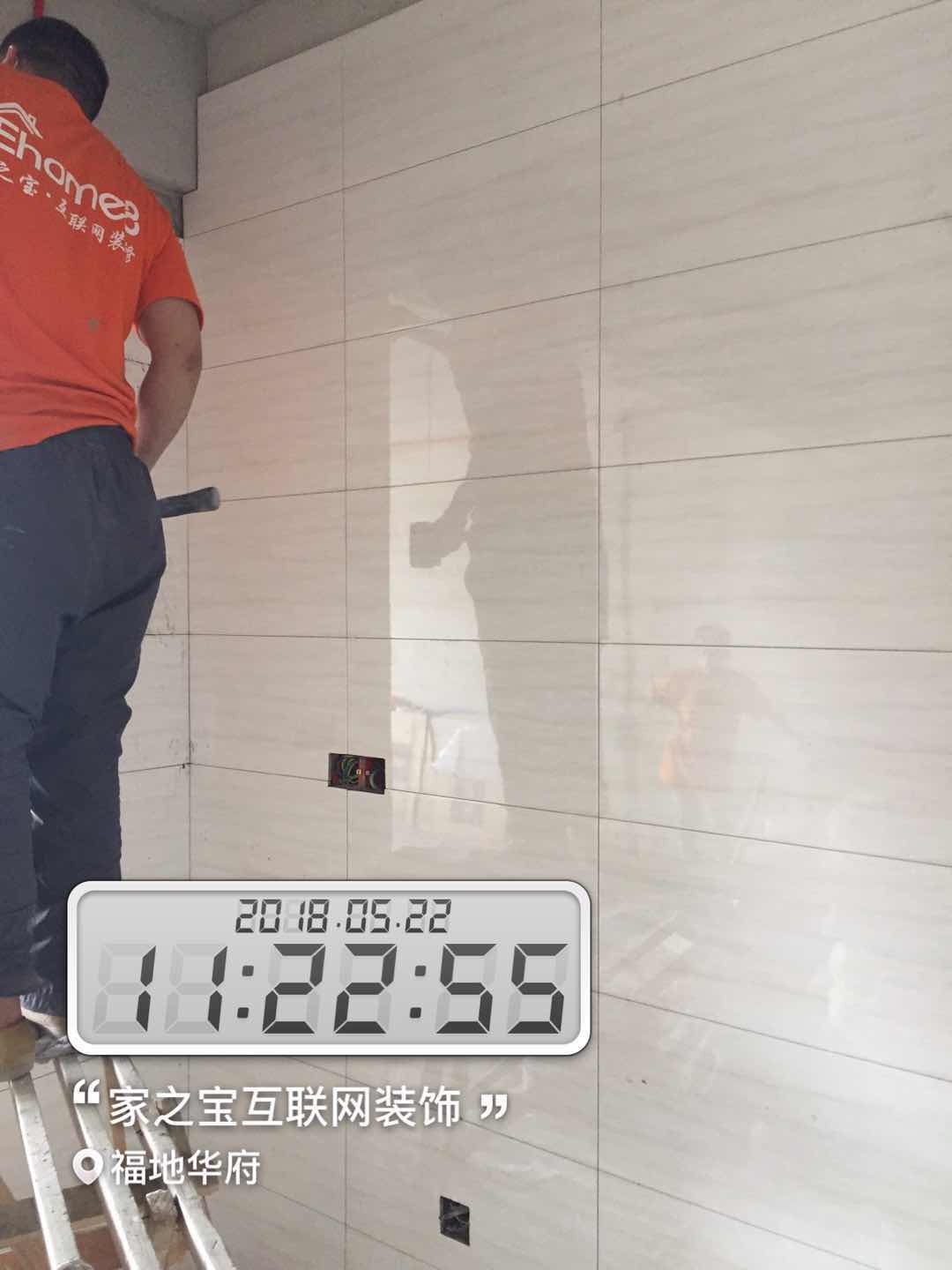 墻磚鋪貼,使用水平儀投射水平線,陽角處采用磨邊45°碰角工藝。