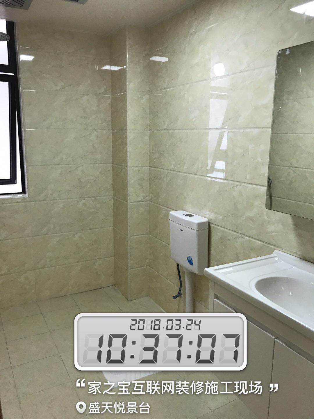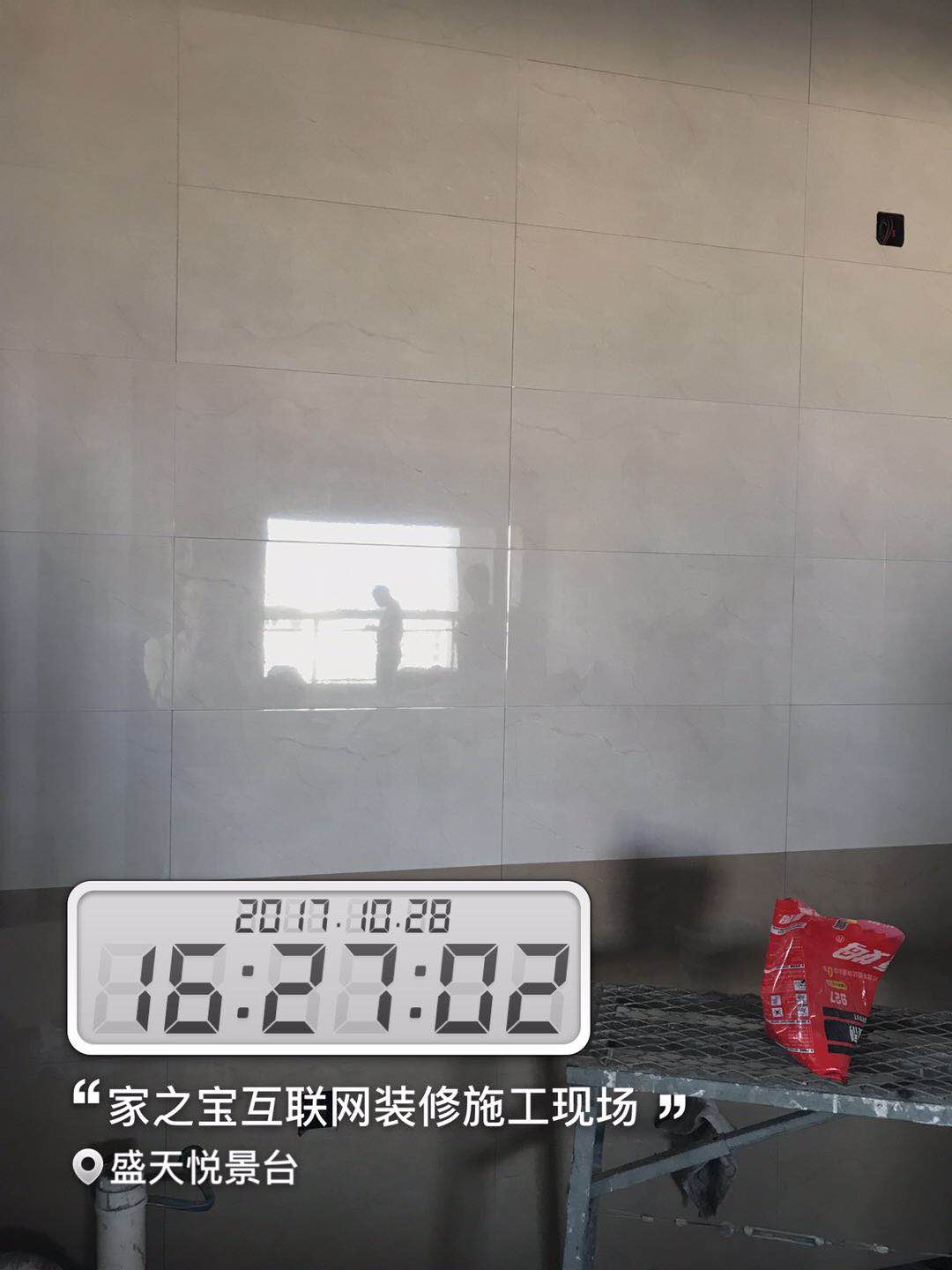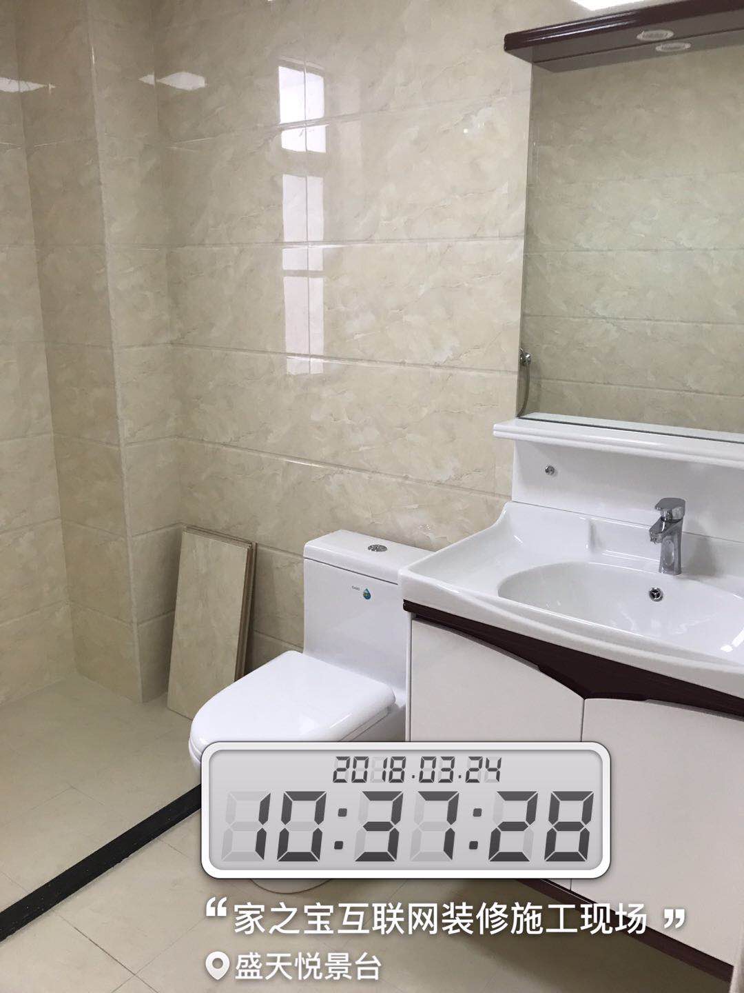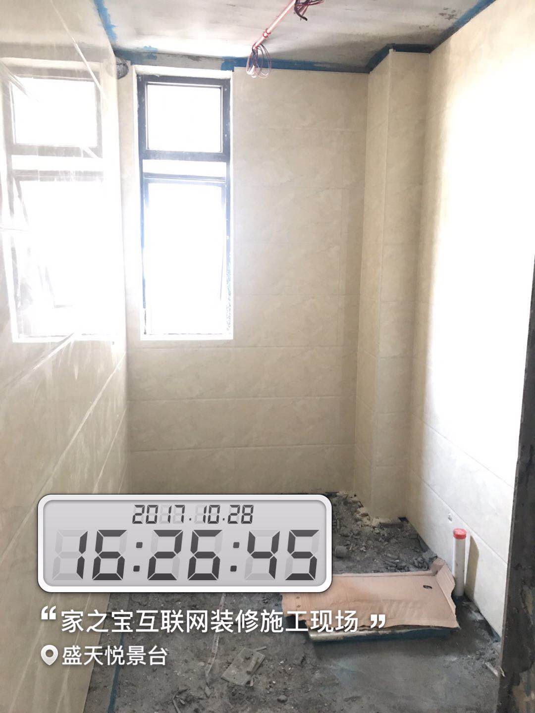 墻磚鋪貼,使用水平儀投射水平線,陽(yáng)角處采用磨邊45°碰角工藝。