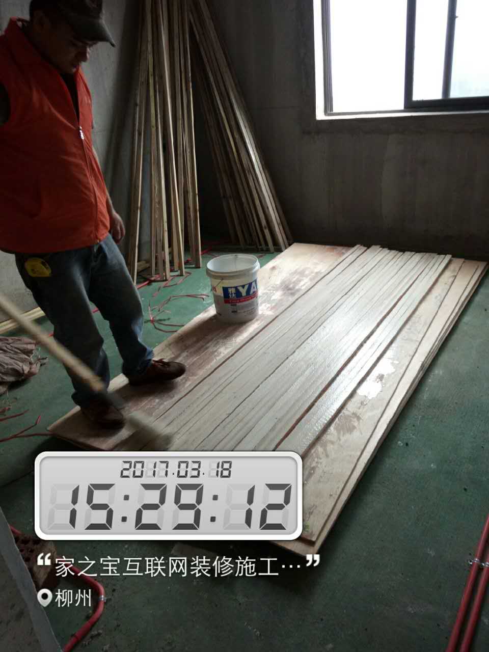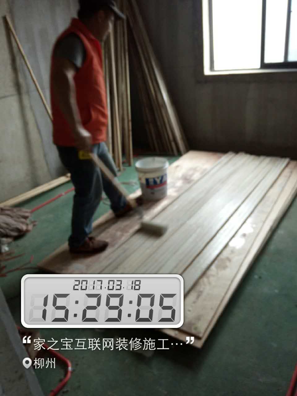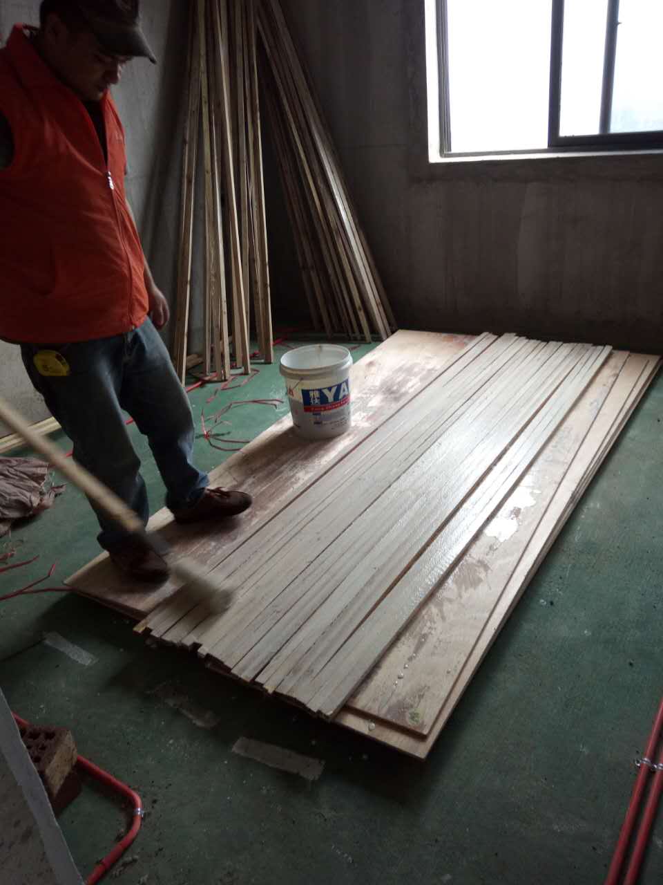 木工進(jìn)場(chǎng)。木工在給方條刷防火涂料
